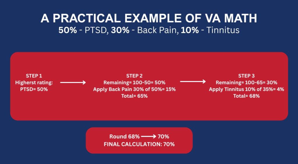 As this example clearly shows, 50 + 30 + 10 does not equal 90 in VA math; it results in a 70% combined rating. This calculation highlights how crucial it is to understand the VA’s method to calculate combined disability ratings.