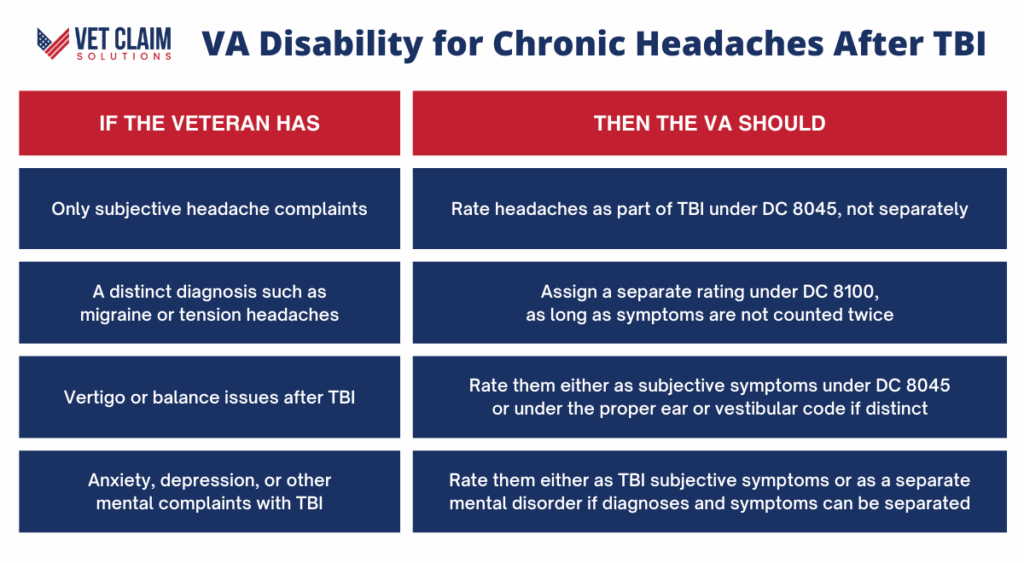 This is only allowed if the symptoms do not overlap with the ones already counted under DC 8045. This point shows up in VA internal guidance at DC 8045 guidance. You can also find this in the VA manual section on neurological conditions here: M21 1 neurological section. This is good news for you if your headaches have a formal diagnosis. Your doctor must show they cause problems above and beyond your base TBI symptoms.