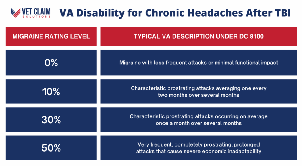 That matters a lot for you. Migraine headaches have their own diagnostic code, DC 8100, with a separate rating scale. This allows you to potentially receive a VA disability benefit for both the TBI itself and the headaches.
