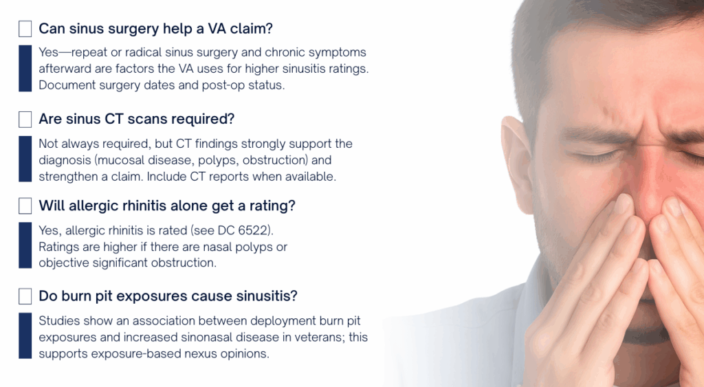 - Veteran A: Deployed 2010–2012, heavy burn pit/dust exposure; began having chronic nasal congestion and repeated sinus infections post-deployment. ENT CT showed pansinusitis, required two FESS procedures and repeated oral steroid bursts. With STRs noting nasal complaints, ENT records, surgery reports, and a nexus letter linking exposure to chronic rhinosinusitis, the veteran secured service connection and an increased rating. (Example uses the evidence types described above and is illustrative.)