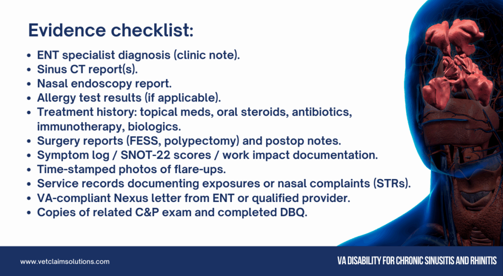 - The fix: Schedule an ENT evaluation. Ask for diagnostic testing (CT scan, sinus X-rays, or nasal endoscopy) and make sure those reports are included with your VA claim. These tests provide the objective medical proof the VA relies on.