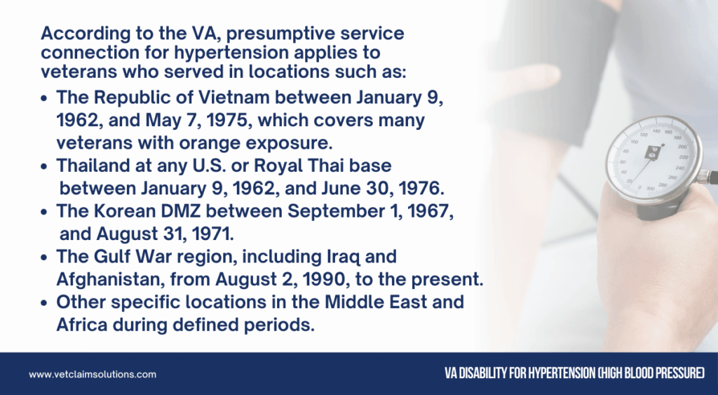 This means if you have a current diagnosis of hypertension and proof of service in a qualifying area and time, the VA automatically connects it for you. This applies to millions of veterans, including those who served in Vietnam and were affected by Agent Orange exposure, as well as those who served in the Gulf War and post-9/11 conflicts.