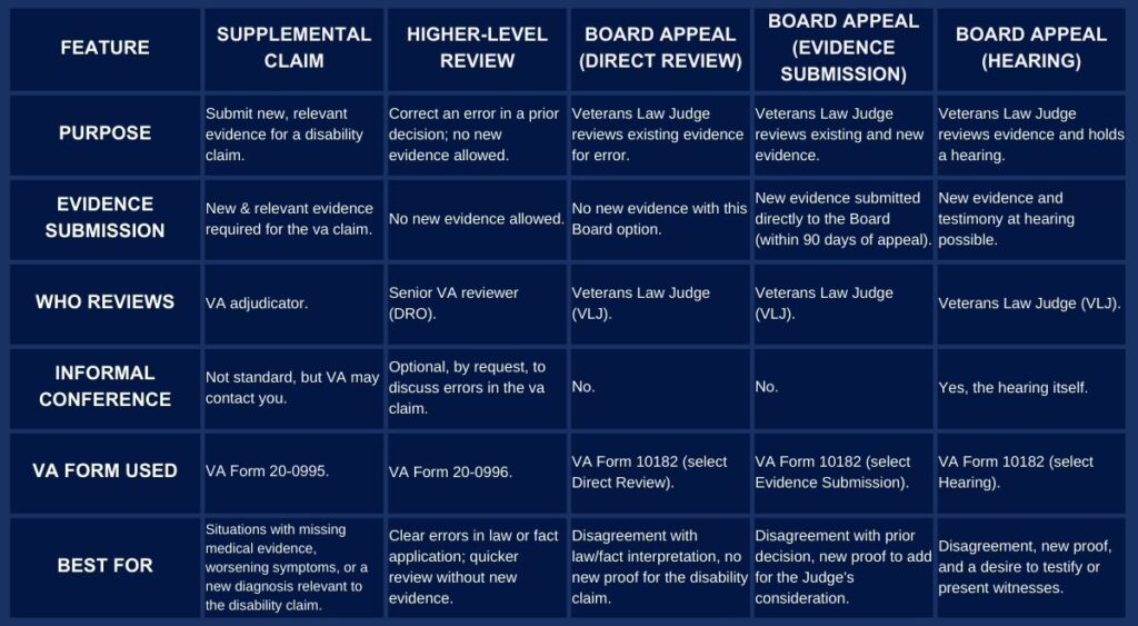 Here is a table summarizing the VA’s main appeal options: